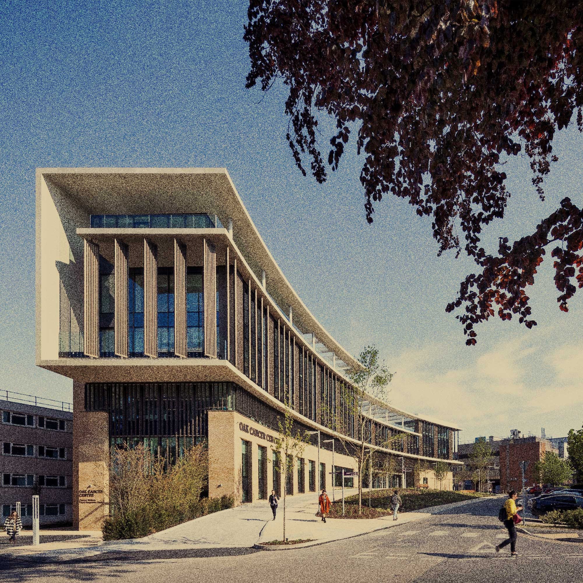 It was an inauspicious start. I arrived at a sea of car parking, at what I thought was a front door to the large and sprawling web of machine-like mechanisms – wrapped, almost apologetically, in dreary skins – that pertain to be architecture. My taxi driver asked if we were near an entrance. The member of staff asked if I was well enough to walk. Having explained I wasn’t a patient, I was directed to a well-concealed door that led to the children’s cancer ward. And so I found my way to the architects and client who were waiting to receive me in the light-filled and surprisingly buzzing lobby of the Oak Cancer Centre.